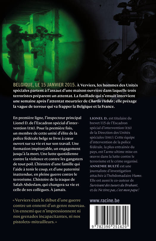 En première ligne, l'inspecteur principal Lionel D. de l'Escadron spécial d'intervention (ESI). Pour la première fois, un membre de cette unité d'élite de la police fédérale belge se livre à coeur ouvert sur sa vie et sur son travail. Une formation impitoyable, un engagement jusqu'à la mort. Une lutte quotidienne contre la violence et contre les gangsters de tout poil. L'histoire d'une famille qui l'aide à tenir le coup, et d'une paternité inattendue, en pleine guerre contre le terrorisme. L'histoire de la traque de Salah Abdeslam, qui changera sa vie et celle de ses collègues. À jamais.