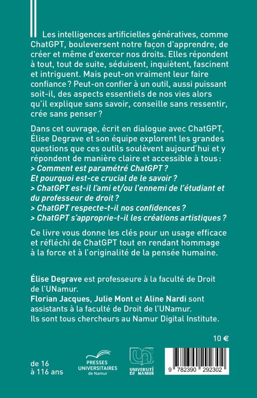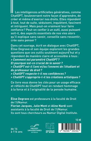 Dans cet ouvrage, écrit en dialogue avec ChatGPT, Élise Degrave et son équipe explorent les grandes questions que ces outils soulèvent aujourd'hui et y répondent de manière claire et accessible à tous :
