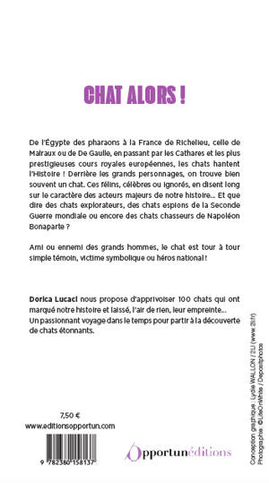 De l’Égypte des pharaons à la France de Richelieu, celle de Malraux ou de De Gaulle, en passant par les Cathares et les plus prestigieuses cours royales européennes, les chats hantent l’Histoire ! Derrière les grands personnages, on trouve bien souvent un chat. Ces félins, célèbres ou ignorés, en disent long sur le caractère des acteurs majeurs de notre histoire… Et que dire des chats explorateurs, des chats espions de la Seconde Guerre mondiale ou encore des chats chasseurs de Napoléon Bonaparte ?