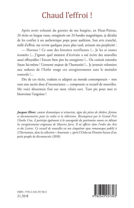 Après avoir exhumé du grenier de ma longère, en Haut-Poitou, 24 récits en langue russe, enregistrés sur 24 bandes magnétiques, je décidai de les confier à un authentique pope pour audition. Son avis tranché, mêlé d'effroi, me revint quelques jours plus tard, attisant ma perplexité : Horreur ! Ce sont des histoires terrifiantes !... Je les ai toutes écoutées !... J'ignore quel monstre d'écrivain a osé écrire des nouvelles aussi effroyables ! Encore bien pire les enregistrer !... On croirait entendre Satan lui-même ! L'ennemi majeur de l'humanité !... Je jetterais volontiers aux ordures de l'Enfer rouge ces enregistrements sans le moindre remords !... Dix de ces récits, traduits et adaptés au monde contemporain non sans une sacrée dose d'inconscience , composent ce recueil de nouvelles. Me voici désormais fixé sur mon vilain sort. Tant pis pour moi et bienvenue l'angoisse !