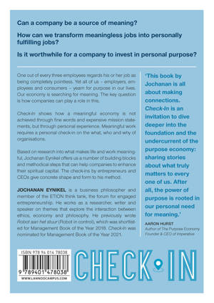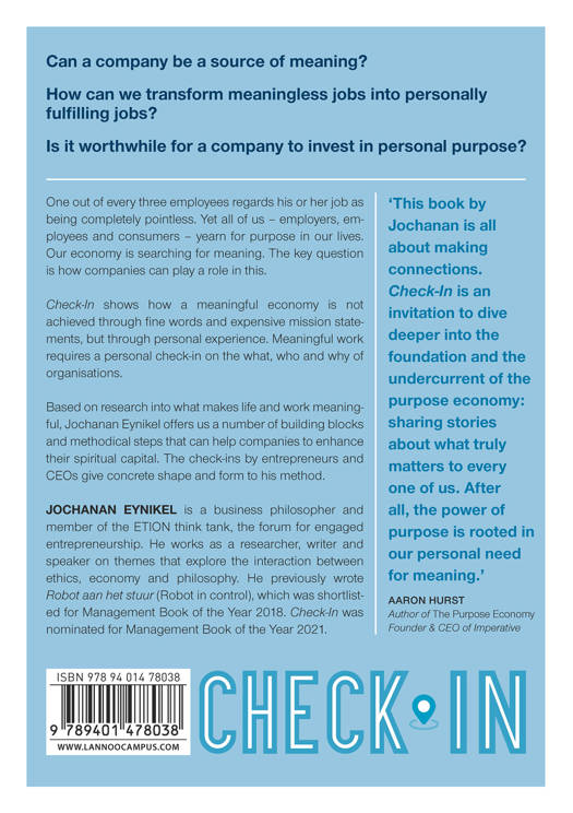Can a company be a source of meaning? How can we transform meaningless jobs into personally fulfilling jobs? Is it worthwhile for a company to invest in personal purpose? One out of every three employees regards his or her job as being completely pointless. Yet all of us - employers, employees and consumers - yearn for purpose in our lives. Our economy is searching for meaning. The key question is how companies can play a role in this. Check-In shows how a meaningful economy is not achieved through fine words and expensive mission statements, but through personal experience. Meaningful work requires a personal check-in on the what, who and why of organisations. Based on research into what makes life and work meaningful, Jochanan Eynikel offers us a number of building blocks and methodical steps that can help companies to enhance their spiritual capital. The check-ins by entrepreneurs and CEOs give concrete shape and form to his method.