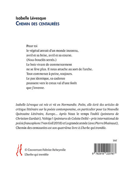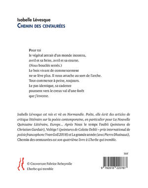 Avec ce nouveau recueil, Isabelle Lévesque poursuit sa quête du lien homme-amour-nature. Chemin des centaurées est une longue promenade dans la campagne durant un long printemps, de mars jusqu’au solstice d’été. La campagne, ses herbes, ses fleurs, ses chemins, ses arbres, ses ciels, ses pluies, font naître la pensée — « Seules les pensées qu’on a en marchant valent quelque chose », écrivait Nietzsche. C'est l’aube de la vie, Isabelle Lévesque ressent chaque matin de cette longue saison comme un renouveau, des renaissances, elle craint la nuit, l’obscurité, la sombre lumière, la poésie c’est la lumière : « Dis encore, dis plus fort, que la nuit n'est tombée qu'un instant. » Marcher sur le chemin des centaurées, c’est aller à la rencontre de nous-mêmes. La poète invite le lecteur à fouler de tels chemins, et franchir les ponts qui comme une tapisserie, retisserons nos liens avec nous-mêmes, ce nous caché, qui est, dans « Chemin des centaurées », un, l’autre et tous. Les remarquables peintures de Fabrice Rebeyrolle ont su capturer, sur les chemins, les centaurées des poèmes.