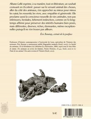 71 textes adressés à 71 animaux, accompagnés de 25 dessins. Une correspondance, un chant d'amour que l'auteure a fini par partager avec le lecteur. Une préface d'Eric Baratay, Professeur d'histoire contemporaine à l'université de Lyon, spécialiste de l'histoire des animaux : « Albane Gellé exprime, à sa manière, tout en littérature, un souhait croissant en Occident: passer sur le versant animal des choses, aller du côté des animaux, s'en approcher au mieux pour mieux les saisir, les ressentir, les vivre, avec empathie et générosité. Elle proclame aussi la conscience nouvelle de vies animales, non pas inférieures, bestiales, bêtement instinctives, comme on l'a longtemps affirmé pour préserver des intérêts humains bien pesés, mais différentes, diverses, riches, étonnantes, même exceptionnelles puisqu'il ne s'en trouve pas ailleurs. (extrait)»
