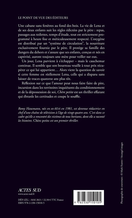 Une cabane sans fenêtres au fond des bois. La vie de Lena et de ses deux enfants suit les règles édictées par le père : repas, passages aux toilettes, temps d'étude, tout est strictement programmé à heure fixe et méticuleusement respecté. L'oxygène est distribué par un "système de circulation", la nourriture exclusivement fournie par le père. Il protège sa famille des dangers du dehors et s'assure que ses enfants, conçus et nés en captivité, auront toujours une mère pour veiller sur eux. Un jour, Lena parvient à s'échapper - mais le cauchemar continue. Il semble que son bourreau veuille à tout prix récupérer ce qui lui appartient... Alors vient la question de savoir si cette femme est réellement Lena, celle qui a disparu sans laisser de traces quatorze ans plus tôt. Réflexion sur ce que l'amour peut nous faire faire de pire, incursion dans les territoires inquiétants du conditionnement et de la d épossession de soi, Chère petite est un thriller effarant qui ébranle les certitudes et coupe le souffle.