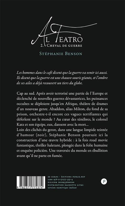 *Les hommes dans le café disent que la guerre va venir ici aussi. Ils disent que la guerre est une chauve-souris géante, et l'ombre de ses ailes a déjà recouvert un tiers du globe. * Cap au sud. Après avoir terrorisé une partie de l'Europe et déclenché de nouvelles guerres dévastatrices, les puissances occultes se déploient jusqu'en Afrique, théâtre de drames d'un nouveau genre. Abaddon, alias Milton, du fond de sa prison, orchestre-t-il encore ces vagues terrifiantes qui déferlent sur le monde ? Au coeur des ténèbres, le colonel Katz et son équipe, eux, dansent avec la mort... Loin des clichés du genre, dans une langue limpide teintée d'humour (noir), Stéphanie Benson poursuit ici la construction d'une oeuvre hybride : à la fois road movie fantastique, thriller haletant, plongée dans la folie humaine et enquête policière. Une traversée du monde en ébullition avant qu'il ne parte en fumée..