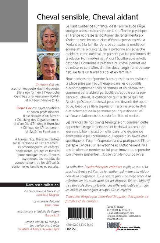 Le Haut Conseil de l’Enfance, de la Famille et de l’Age, souligne une surmédication de la souffrance psychique en France et presse les politiques de santé mentale à s’orienter vers les approches d’écoute personnalisée à l’enfant et à la famille. Dans ce contexte, la médiation équine attise la curiosité, de la personne en recherche d’aide au corps médical, en passant par les passionnés de la relation Homme-Animal. A qui l’équithérapie est-elle destinée ? Comment la présence du cheval permet-elle de mieux se connaitre, d’initier des changements personnels, de faire un travail sur soi et en famille ? Nous tentons de répondre à ces questions en resituant la place prise par l’équithérapie dans les dispositifs d’accompagnement des personnes et en découvrant comment cette aide si particulière s’appuie sur la sentience du cheval, la conscience qu’il a de ce qu’il vit. Ainsi la présence du cheval peut-elle devenir thérapeutique, lorsque sa libre expression résonne avec le style d’attachement de la personne pour questionner les schémas relationnels de sa vie familiale et sociale. Les séances de nos clients témoigneront combien cette approche plonge la personne et le cheval au coeur de leur sensibilité interactionnelle, dans une expérience émotionnelle peu commune qui requiert un savoir-être spécifique de l’équithérapeute dans la pratique de l’Équithérapie Centrée sur la Personne et l’Attachement. Nul besoin alors de monter sur lui pour trouver ou reprendre son chemin existentiel... Observons-le nous observer !