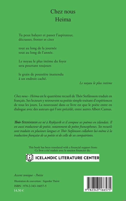 Chez nous - Heima est le quatrième recueil de Thór Stefánsson traduit en français. Ses lecteurs y retrouvent sa poésie simple traitant d'expériences de tous les jours. Dans cet ouvrage le poète islandais dialogue avec les auteurs qui l'ont précédé, avec entre autres Albert Camus.