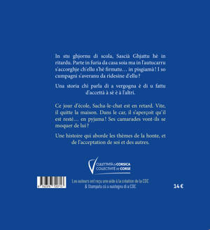 Ce jour d’école, Sacha-le-chat est en retard. Vite, il quitte la maison. Dans le car, il s’aperçoit qu’il est resté… en pyjama ! Ses camarades vont-ils se moquer de lui ?Une histoire qui aborde les thèmes de la honte, et de l’acceptation de soi et des autres.In stu ghjornu di scola, Sascià Ghjattu hè in ritardu. Parte in furia da casa soia ma in l'autucarru s'accorghje ch'ellu s'hè firmatu… in pisgiamà ! I so cumpagni s'averanu da rìdesine d'ellu ?Una storia chì parla di a vergogna è di u fattu d'accettà à sè è à l'altri.