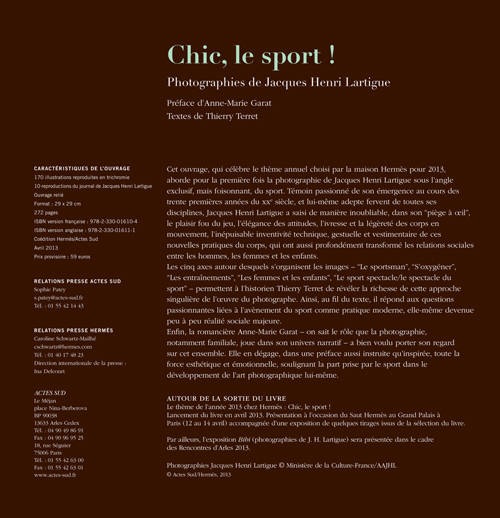 Cet album, coédité par Actes Sud et Hermès, se propose d'aborder la thématique du sport dans l'oeuvre foisonnante de Jacques Henri Lartigue à travers une sélection d'images issues de ses fameux albums.