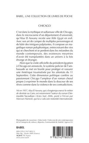 C'est dans la mythique et sulfureuse ville de Chicago, dans le microcosme d'un département d'université, qu'Alaa El Aswany recrée une little Egypt en exil. Avec son art de camper de multiples personnages et de bâtir des intrigues palpitantes, il compose un magnifique roman polyphonique, entrecroisant des vies qui se cherchent et se perdent dans les méandres du monde contemporain, des existences meurtries d'avoir été transplantées dans un univers à la fois étrange et étranger. Alors que la visite officielle du président égyptien à Chicago est annoncée, le système policier de l'ambassade se met en branle pour protéger et rassurer une Amérique traumatisée par les attentats du 11 Septembre. Cette dimension politique confère au passionnant Chicago l'ampleur d'un roman choral propre à exprimer le monde dans la douceur de ses rêves comme dans la violence de ses contradictions.