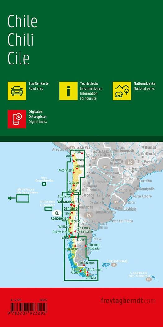 Deze gedetailleerde wegenkaart van Chili is zeer geschikt voor het plannen en rondtrekken door het land.