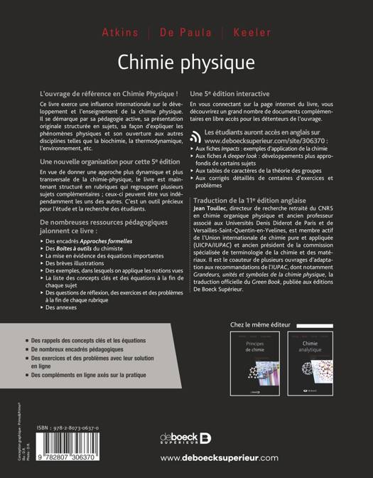 Chimie physique de Atkins est un ouvrage fondamental qui, depuis sa première édition en 1978, a exercé une influence prépondérante sur le développement et l'enseignement de la chimie physique dans le monde. Par une présentation originale fondée, d'une part, sur l'explication raisonnée des phénomènes physiques de la matière, et, d'autre part, sur les liens qui mettent la chimie physique en amont des autres disciplines plus spécialisées de la biochimie, de la thermodynamique, des sciences de l'environnement, etc., l'oeuvre de Peter Atkins, de Julio de Paula et de James Keeler s'est avérée essentielle au cours de ces dernières années comme ouvrage d'accompagnement des cours de chimie et comme traité général donnant à tous les scientifiques une vue complète et précise de la chimie physique, science ardue mais primordiale.