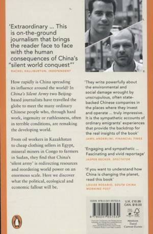 How rapidly is China spreading its influence around the world? From oil workers in Kazakhstan to cheap clothing sellers in Egypt, mineral miners in Congo to farmers in Sudan, the author's find that China's 'silent army' is redirecting resources and reordering world power on an enormous scale.