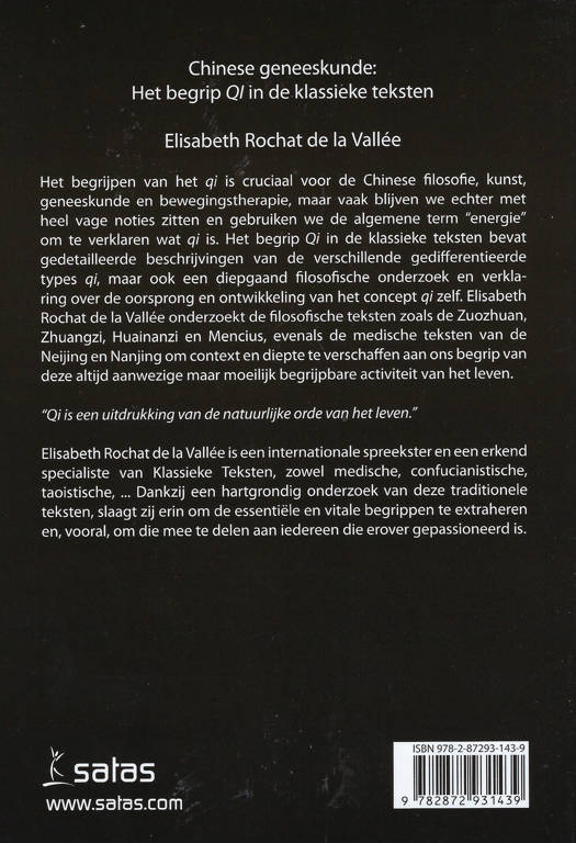 Het begrijpen van het Qi is cruciaal voor de Chinese filosofie, kunst, geneeskunde en bewegingstherapie, maar vaak blijven we echter met heel vage noties zitten en gebruiken we de algemene term "energie" om te verklaren watqiis. Het begrip Qi in de klassieke teksten bevat gedetailleerde beschrijvingen van de verschillende gedifferentieerde types Qi, maar ook een diepgaand filosofische onderzoek en verklaring over de oorsprong en ontwikkeling van het concept Qi zelf. Elisabeth Rochat de la Vallée onderzoekt de filosofische teksten zoals de Zuozhuan, Zhuangzi, Huainanzi en Mencius, evenals de medische teksten van de Neijing en Nanjing om context en diepte te verschaffen aan ons begrip van deze altijd aanwezige maar moeilijk begrijpbare activiteit van het leven.