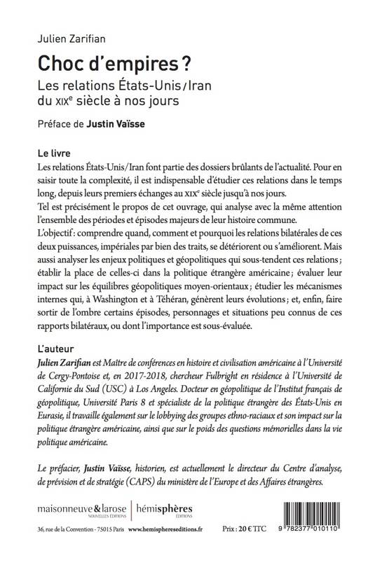 Une étude des relations États-Unis / Iran dans leur complexité et sur leurs temps longs, depuis les premiers échanges entre Américains et Perses jusqu'à aujourd'hui. Quand, comment et pourquoi les relations bilatérales de ces deux puissances, impériales par bien des traits, se détériorent ou s'améliorent-elles ?