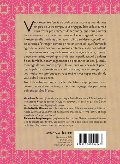 Vous ressentez l'envie de profiter des vacances pour donner un peu de votre temps, vous engager, être solidaire, mais vous n'avez pas vraiment d'idée sur ce que vous pourriez faire et encore moins par où commencer. Cet ouvrage est pour vous. Il existe en effet mille et une façons d'être solidaire aujourd'hui : en partant à l'étranger, comme en restant chez soi ; que l'on veuille agir seul ou avec des amis, ou même en famille, avec des enfants ou des adolescents. Séjour humanitaire, congé solidaire, mission d'écovolontariat, wwoofing, chantier participatif, accueil d'enfants à son domicile, accompagnement de personnes isolées, jusqu'au montage de son propre projet : les auteurs vous dévoilent peu à peu la palette de solutions qui s'offre à vous, vous interrogent sur vos motivations profondes et vous révèlent vos capacités, afin de vous aider à vous lancer.