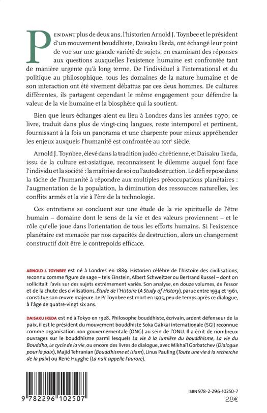 Pendant plus de deux ans, l'historien Arnold J. Tounbee et le président d'un mouvement bouddhiste, Daisaku Ikeda, ont échangé leur point de vue sur une grande variété de sujets. De l'individuel à l'international et du politique au philosophique, tous les domaines de la nature humaine et de son interaction ont été vivement débattus par les deux hommes. De cultures différentes, ils partagent cependant le même engagement pour défendre la valeur de la vie humaine et la biosphère qui la soutient.