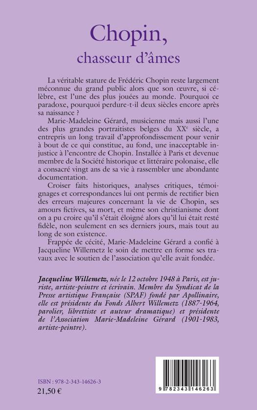 Marie-Madeleine Gérard, musicienne mais aussi l'une des plus grandes portraitistes belges du XXe siècle, a entrepris un long travail d'approfondissement pour venir à bout de ce qui constitue, au fond, une inacceptable injustice à l'encontre de Chopin. Croiser faits historiques, analyses critiques, témoignages et correspondances lui ont permis de rectifier bien des erreurs majeures sa vie, ses amours fictives, sa mort, et même son christianisme auquel il est resté fidèle, non seulement en ses derniers jours, mais tout au long de son existence.
