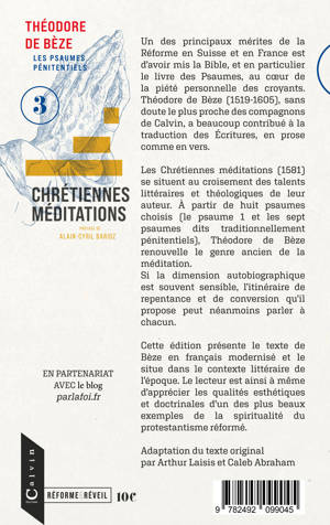 Les Chrétiennes méditations (1581) se situent au croisement des talents littéraires et théologiques de leur auteur. À partir de huit psaumes choisis (le psaume 1 et les sept psaumes dits traditionnellement pénitentiels), Théodore de Bèze renouvelle le genre ancien de la méditation. Si la dimension autobiographique est souvent sensible, l'itinéraire de repentance et de conversion qu'il propose peut néanmoins parler à chacun.