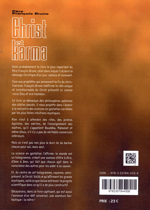 Le message du Christ a-t-il encore sa place dans un monde où les traditions spirituelles se croisent, s’interrogent et parfois se heurtent ? Face aux mutations des consciences et aux attentes spirituelles contemporaines, François Brune, prêtre orthodoxe et penseur libre, propose une lecture audacieuse et profondément éclairante de la figure du Christ à la lumière du concept de karma et de la réincarnation. Dans ce livre, il s'appuie sur une double exigence : la fidélité au cœur du message évangélique – celui de l’amour, du pardon et de la résurrection – et l'ouverture à une compréhension élargie de la condition humaine, telle que la proposent les sagesses de l’Orient et certaines expériences spirituelles contemporaines. En s’interrogeant sur la justice divine, le sens de la souffrance, la mémoire des vies passées et l'évolution de l’âme à travers le temps, François Brune invite à repenser la vision chrétienne de l’au-delà. Ce livre ne cherche ni à trancher dogmatiquement, ni à réduire la foi à un syncrétisme simpliste. Il s’agit plutôt d’un pont tendu entre deux mondes, d’une tentative de dialogue où la profondeur de la tradition chrétienne dialogue avec les intuitions du karma pour nourrir une espérance renouvelée. Plus que jamais, ce texte résonne comme une méditation sur le devenir de l’Homme, l’universel du message christique et la possible convergence des grandes voies spirituelles de l’humanité.