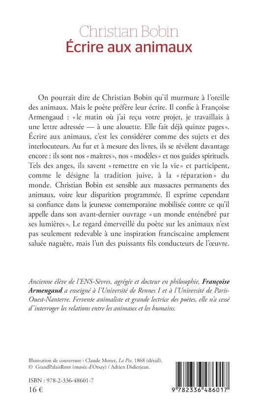 On pourrait dire de Christian Bobin qu’il murmure à l’oreille des animaux. Mais le poète préfère leur écrire. Il confie à Françoise Armengaud : « le matin où j’ai reçu votre projet, je travaillais à une lettre adressée — à une alouette. Elle fait déjà quinze pages ». Écrire aux animaux, c’est les considérer comme des sujets et des interlocuteurs. Au fur et à mesure des livres, ils se révèlent davantage encore : ils sont nos « maîtres », nos « modèles » et nos guides spirituels. Tels des anges, ils savent « remettre en vie la vie » et participent, comme le désigne la tradition juive, à la « réparation » du monde. Christian Bobin est sensible aux massacres permanents des animaux, voire leur disparition programmée. Il exprime cependant sa confiance dans la jeunesse contemporaine mobilisée contre ce qu’il appelle dans son avant-dernier ouvrage « un monde enténébré par ses lumières ». Le regard émerveillé du poète sur les animaux n’est pas seulement redevable à une inspiration franciscaine amplement saluée naguère, mais l’un des puissants fils conducteurs de l’œuvre.