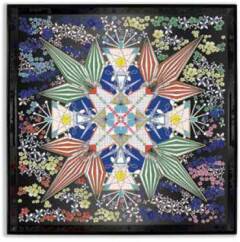 The Christian Lacroix Flowers Galaxy Square Lacquer Tray features a geometric kaleidoscopic pattern combined with small scale multi-colored flowers. The outside of this elegant 12-inch square tray has a sleek shiny black lacquer exterior with cut out handles on two sides.