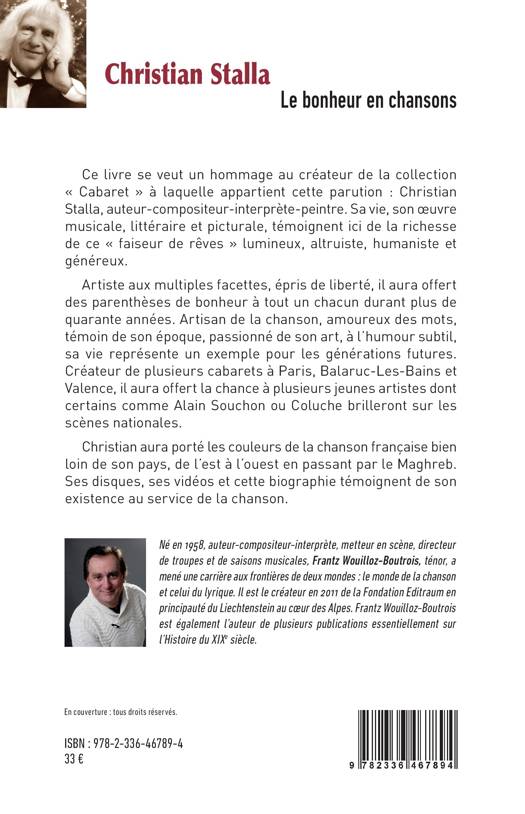 Ce livre se veut un hommage au créateur de la collection « Cabaret » à laquelle appartient cette parution : Christian Stalla, auteur-compositeur-interprète-peintre. Sa vie, son œuvre musicale, littéraire et picturale, témoignent ici de la richesse de ce « faiseur de rêves » lumineux, altruiste, humaniste et généreux. Artiste aux multiples facettes, épris de liberté, il aura offert des parenthèses de bonheur à tout un chacun durant plus de quarante années. Artisan de la chanson, amoureux des mots, témoin de son époque, passionné de son art, à l’humour subtil, sa vie représente un exemple pour les générations futures. Créateur de plusieurs cabarets à Paris, Balaruc-Les-Bains et Valence, il aura offert la chance à plusieurs jeunes artistes dont certains comme Alain Souchon ou Coluche brilleront sur les scènes nationales. Christian aura porté les couleurs de la chanson française bien loin de son pays, de l’est à l’ouest en passant par le Maghreb. Ses disques, ses vidéos et cette biographie témoignent de son existence au service de la chanson.