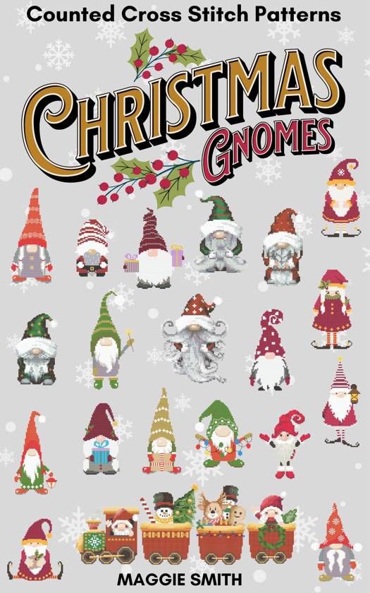 This book contains a wonderful assortment of 25 Christmas Gnome patterns perfect for ornaments, cards, and other small applications. If stitching on Aida 14, the largest finished pattern would be aprox. 3.9 inches wide. Most are smaller. :)