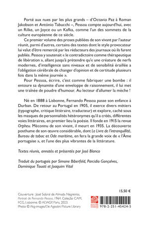 Porte aux nues par les plus grands - d'Octavio Paz a Roman Jakobson et Antonio Tabucchi -, Pessoa compte aujourd'hui, avec un Rilke, un Joyce ou un Kafka, comme l'un des sommets de la culture europeenne de ce siecle. Ce premier volume des proses publiees de son vivant par l'auteur reunit, parmi d'autres, certains des textes dont le style provocateur lui valut d'etre remercie par les redacteurs des journaux ou ils furent publies. Pessoa y soutenait le contradictoire comme therapeutique de liberation , allant jusqu'a pretendre qu' une creature de nerfs modernes, d'intelligence sans niveaux et de sensibilite eraillee a l'obligation cerebrale de changer d'opinion et de certitude plusieurs fois dans la meme journee . Pour Pessoa, ecrire, c'est comme fabriquer une bombe: il entoure sa dynamite d'une enveloppe de raisonnement, il lui met une trainee de poudre d'humour. Au lecteur d'allumer la meche !