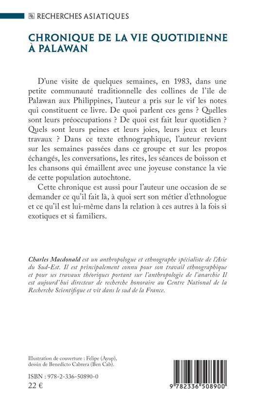 D’une visite de quelques semaines, en 1983, dans une petite communauté traditionnelle des collines de l’île de Palawan aux Philippines, l’auteur a pris sur le vif les notes qui constituent ce livre. De quoi parlent ces gens ? Quelles sont leurs préoccupations ? De quoi est fait leur quotidien ? Quels sont leurs peines et leurs joies, leurs jeux et leurs travaux ? Dans ce texte ethnographique, l’auteur revient sur les semaines passées dans ce groupe et sur les propos échangés, les conversations, les rites, les séances de boisson et les chansons qui émaillent avec une joyeuse constance la vie de cette population autochtone. Cette chronique est aussi pour l’auteur une occasion de se demander ce qu’il fait là, à quoi sert son métier d’ethnologue et ce qu’il est lui-même dans la relation à ces autres à la fois si exotiques et si familiers.