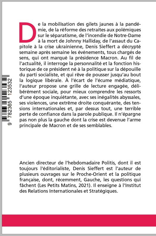 Éditorialiste depuis vingt ans de l’hebdomadaire Politis, Denis Sieffert a réuni ici une sélection d’une soixantaine de textes qui couvre les cinq années de la présidence Macron. Il propose une grille de lecture originale des grands débats et des conflits qui ont jalonné ces années. Au fil des événements, il interroge les évolutions d’une personnalité qui, apôtre du « ni droite ni gauche », a fini par fracturer la société et favoriser la droitisation extrême du paysage politique. Denis Sieffert revient aussi sur des événements qui ont mobilisé, inquiété ou ému l’opinion dont il met en évidence le sens politique : que signifie l’émotion populaire suscitée par la disparition de Johnny Halliday ? Que nous disent de notre époque les réactions à l’incendie de Notre-Dame ? Ou les hommages à Jacques Chirac et à Bernard Tapie, en passant par la liesse permissive qui a accompagné la victoire de la France à la coupe du monde de football ? Mais ce sont surtout les débats sur les retraites, la laïcité, le « séparatisme », la fin de vie, avec l’affaire Vincent Lambert, et évidemment la crise des gilets jaunes, que l’on retrouve dans ces pages, tels qu’ils ont été vécus et analysés dans l’instant. <br /><br /> L’auteur revient aussi sur les ambivalences de la fameuse diplomatie de la tape dans le dos, face à Trump ou Poutine. Il rappelle quelques compromissions que la realpolitik ne suffit pas à expliquer, comme cette « légion de déshonneur » décernée au dictateur égyptien Al-Sissi. Il interroge enfin l’institution présidentielle dont Emmanuel Macron a accentué la verticalité, notamment dans la gestion de la pandémie. Des questions de pleine actualité.<br /><br /> Denis Sieffert n’épargne pas non plus la gauche dont la faiblesse historique est le meilleur atout de Macron. Il livre sur tous ces sujets une analyse qui échappe aux effets de meute médiatiques, et se garde, malgré la sévérité de la critique, de tout esprit de système qui ferait de la contradiction son objet principal.