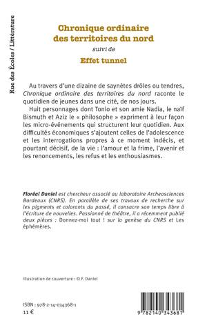 Au travers d une dizaine de saynètes drôles ou tendres, Chronique ordinaire des territoires du nord raconte le quotidien de jeunes dans une cité, de nos jours. Huit personnages dont Tonio et son amie Nadia, le naïf Bismuth et Aziz le « philosophe » expriment à leur façon les micro-événements qui structurent leur quotidien. Aux difficultés économiques s ajoutent celles de l adolescence et les interrogations propres à ce moment indécis, et pourtant décisif, de la vie : l'amour et la frime, l'avenir et les renoncements, les refus et les enthousiasmes.