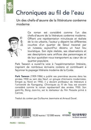 Ce roman est considéré comme l’un des chefsâd’oeuvre de la littérature coréenne moderne. Offrant une représentation minutieuse et réaliste de la vie urbaine, l’auteur y dépeint les différentes couches d’un quartier de Séoul traversé par un ruisseau aujourd’hui devenu un haut lieu touristique. Son style réaliste, ses observations et ses descriptions sans artifices des personnages et de leur quotidien nous transportent au coeur de ce quartier populaire. Park Taewon a ouvert la voie à l’expérimentation littéraire, inspirant de nombreux écrivains coréens et contribuant à façonner le paysage littéraire moderne de la Corée. Ce roman est une plongée passionnante dans l’histoire de sa capitale et un hommage à l’écriture de Park Taewon, dont la contribution à la littérature coréenne est considérable. Park Taewon (1909-1986) a publié ses premières oeuvres dans les années 1930 au sein des Neuf, un groupe d’écrivains modernistes. Émigré au Nord en 1950, il y devient professeur de littérature à l’université de Pyongyang. Publiée sous forme de feuilleton en 1934 dans le quotidien Chosun Ilbo, sa nouvelle semi-autobiographique, « Une journée dans la vie du romancier Gubo » décrit ses observations au fil de ses promenades. « Chroniques au fil de l’eau » est souvent considéré comme le roman représentatif des années 1930. Avec Yi Sang, Park a rejeté la littérature didactique et a souligné l’importance d’apprécier la littérature en tant qu’art linguistique. En 1945, après la libération, il devient membre du Comité exécutif central de l’Alliance des écrivains coréens. Il est décédé en 1986 en Corée du Nord. Son petit-fils, Bong Joon-ho, est le réalisateur du film « Parasite » primé à Cannes.