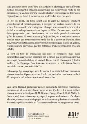 Voici plusieurs mois que j'écris des articles et chroniques sur différents médias, concernant la situation économique que nous vivons. Au fil de ces chroniques, j'ai vu, tout comme vous, la situation économique se détériorer. Et j'analysais au fur et à mesure ce qui se déroulait sous nos yeux. En cet été 2022, j'ai tenu, avant que la crise ne démarre vraiment officiellement et médiatiquement, à compiler un certain nombre de ces textes, dans un ordre chronologique, afin que vous constatiez comment a évolué le monde qui nous entoure depuis ce début d'année 2022; quelle a été sa progression, son cheminement, et celui de la pensée économique qu'est la mienne. Et vous noterez qu'aujourd'hui, on a tendance à mettre tous les maux que nous subissons sur le dos de la guerre en Ukraine, alors que, bien avant cette guerre, les problèmes économiques étaient en germe, et qu'ils ont été provoqués par les politiques menées pendant la crise du COVID. Ce sont en tout 20 chroniques qui sont ici compilées, mais aussi commentées, analysées et enrichies par la vision que je porte aujourd'hui sur ce que j'ai écrit à tel ou tel instant. Parmi ces 20 chroniques, 3 textes inédits en fin d'ouvrage. Dont le dernier se nomme: La Troisième Guerre mondiale: est-ce pour cette fois ? Cet ouvrage fige en quelque sorte le monde à un instant donné, mais dans plusieurs années, il pourra encore être lu par toutes les personnes voulant décortiquer le mécanisme ayant mené à une crise... Jean-David Haddad, professeur agrégé, économiste éclectique, sociologue, chroniqueur, et bien sûr éditeur, signe ici son 23e livre. Il a aussi préfacé plusieurs auteurs classiques (J. M. Keynes, George Orwell, H. G. Wells, R. Guénon, etc). Avec cet ouvrage atypique, il se propose de suivre et d'analyser à la trace, en une centaine de pages, les mécanismes qui mènent à une crise économico-politico-sociale, en l'occurrence celle qui est en germe en 2022.