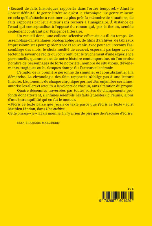 Jean-François Marguerin a mené une longue carrière au ministère de la Culture, où il a notamment dirigé les DRAC de Lorraine, de Haute-Normandie et de Rhône-Alpes. Entre autres fonctions rue de Valois, il a été conseiller technique au sein du cabinet de Catherine Trautmann et, à ce titre, la principale plume de la charte des missions de service public. Il a ensuite dirigé l’Institut français de Casablanca, puis le Centre national des arts du cirque (CNAC) à Châlons-en-Champagne. Ces chroniques rapportent une collection de souvenirs qui permettent d'éclairer les raisons d'un engagement, et le parcours d'une vie.