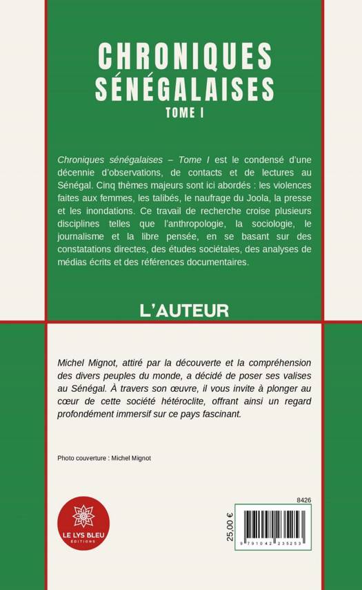 Chroniques sénégalaises - Tome I est le condensé d'une décennie d'observations, de contacts et de lectures au Sénégal. Cinq thèmes majeurs sont ici abordés : les violences faites aux femmes, les talibés, le naufrage du Joola, la presse et les inondations. Ce travail de recherche croise plusieurs disciplines telles que l'anthropologie, la sociologie, le journalisme et la libre pensée, en se basant sur des constatations directes, des études sociétales, des analyses de médias écrits et des références documentaires.