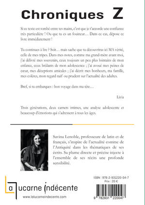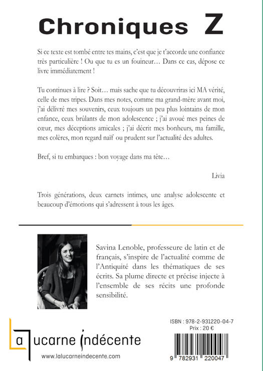 Inspirée par les carnets de vie de sa grand-mère, Livia partage avec nous les ressentis d’une jeune adolescente en pleine évolution. S’appuyant sur des événements culturels, politiques, sportifs ou des catastrophes naturelles qui ont marqué son époque, elle retrace honnêtement sa vie de famille, ses relations amicales ou amoureuses, ses passions, mais aussi ses peines et ses colères.<br /><br /> Avec Chroniques Z, Savina Lenoble nous confronte à trois générations qui, pourtant temporellement proches, incarnent des visions du monde et de la vie fort divergentes. Sa plume directe et précise injecte à l’ensemble du récit une profonde sensibilité.<br /><br /><br /> Savina Lenoble, professeure de latin et de français, s’inspire de l’actualité comme de l’Antiquité dans les thématiques de ses écrits. Sa plume directe et précise injecte à l’ensemble du récit une profonde sensibilité. Elle publie actuellement une trilogie dont le premier tome, Insulae. La reine des abeilles (Il était un bouquin), a été primé.<br />