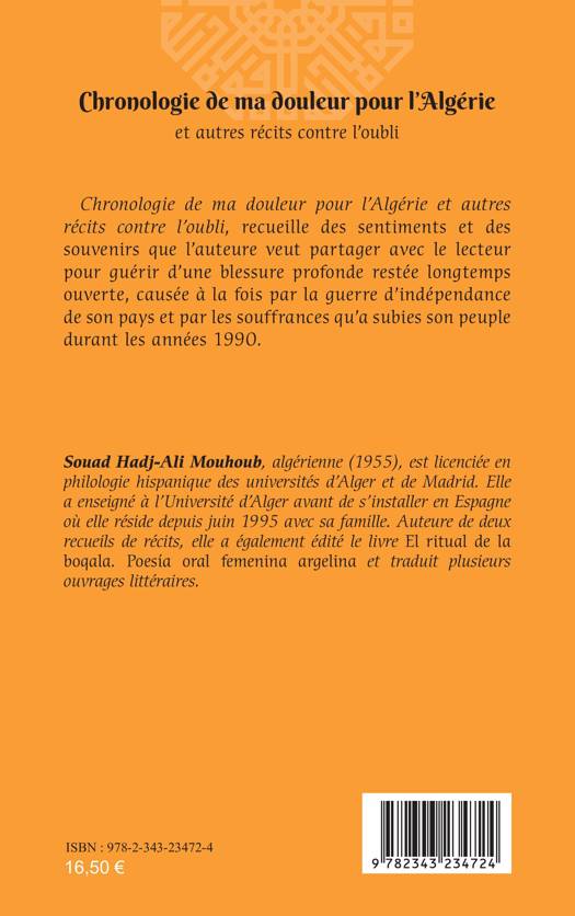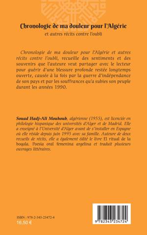 Chronologie de ma douleur pour l'Algérie et autres récits contre l'oubli recueille des sentiments et des souvenirs que l'auteure veut partager avec le lecteur pour guérir d'une blessure profonde restée longtemps ouverte, causée à la fois par la guerre d'indépendance de son pays et par les souffrances qu'a subies son peuple durant les années 1990.