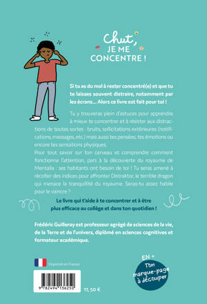 Tu y trouveras plein d’astuces pour apprendre à mieux te concentrer et à résister aux distractions de toutes sortes : bruits, sollicitations extérieures (notifications, messages, etc.) mais aussi tes pensées, tes émotions ou encore tes sensations physiques. Tu y trouveras également des conseils pour te sentir plus détendu(e) et en meilleure forme.