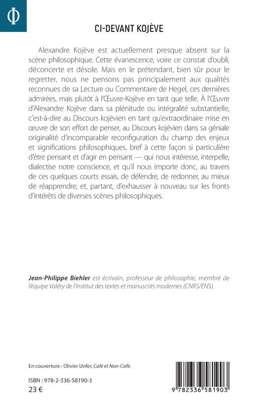 Alexandre Kojève est actuellement presque absent sur la scène philosophique. Cette évanescence, voire ce constat d'oubli, déconcerte et désole. Mais en le prétendant, bien sûr pour le regretter, nous ne pensons pas principalement aux qualités reconnues de sa Lecture ou Commentaire de Hegel, ces dernières admirées, mais plutôt à l'OEuvre-Kojève en tant que telle. À l'OEuvre d'Alexandre Kojève dans sa plénitude ou intégralité substantielle, c'est-à-dire au Discours kojévien en tant qu'extraordinaire mise en oeuvre de son effort de penser, au Discours kojévien dans sa géniale originalité d'incomparable reconfiguration du champ des enjeux et significations philosophiques, bref à cette façon si particulière d'être pensant et d'agir en pensant - qui nous intéresse, interpelle, dialectise notre conscience, et qu'il nous importe donc, au travers de ces quelques courts essais, de défendre, de redonner, au mieux de réapprendre, et, partant, d'exhausser à nouveau sur les fronts d'intérêts de diverses scènes philosophiques.