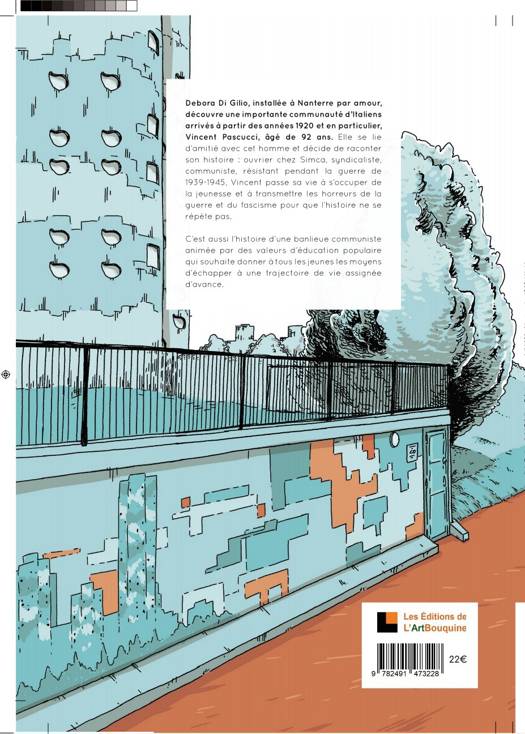 Debora Di Gilio, installée à Nanterre par amour, découvre une importante communauté d’Italiens arrivés à partir des années 1920 et en particulier, Vincent Pascucci, âgé de 92 ans. Elle se lie d’amitié avec cet homme et décide de raconter son histoire : ouvrier chez Simca, syndicaliste, communiste, résistant pendant la guerre de 1939-1945, Vincent passe sa vie à s’occuper de la jeunesse et à transmettre les horreurs de la guerre et du fascisme pour que l’histoire ne se répète pas. C’est aussi l’histoire d’une banlieue communiste animée par des valeurs d’éducation populaire qui souhaite donner à tous les jeunes les moyens d’échapper à une tra jectoire de vie assignée d’avance.