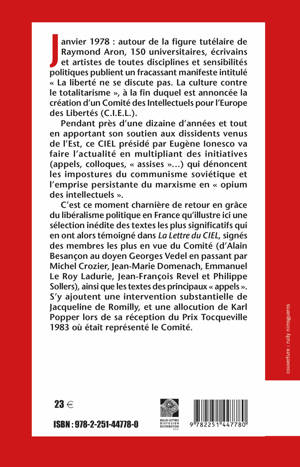 Janvier 1978: autour de la figure tutelaire de Raymond Aron, 150 universitaires, ecrivains et artistes de toutes disciplines et sensibilites politiques publient un fracassant manifeste intitule La liberte ne se discute pas. La culture contre le totalitarisme , a la fin duquel est annoncee la creation d'un Comite des Intellectuels pour l'Europe des Libertes (C.I.E.L.). Pendant pres d'une dizaine d'annees et tout en apportant son soutien aux dissidents venus de l'Est, ce CIEL preside par Eugene Ionesco va faire l'actualite en multipliant des initiatives (appels, colloques, assises ...) qui denoncent les impostures du communisme sovietique et l'emprise persistante du marxisme en opium des intellectuels . C'est ce moment charniere de retour en grace du liberalisme politique en France qu'illustre ici une selection inedite des textes les plus significatifs qui en ont alors temoigne dans La Lettre du CIEL, signes des membres les plus en vue du Comite (d'Alain Besancon au doyen Georges Vedel en passant par Michel Crozier, Jean-Marie Domenach, Emmanuel Le Roy Ladurie, Jean-Francois Revel et Philippe Sollers), ainsi que les textes des principaux appels . S'y ajoutent une intervention substantielle de Jacqueline de Romilly, et une allocution de Karl Popper lors de sa reception du Prix Tocqueville 1983 ou etait represente le Comite.