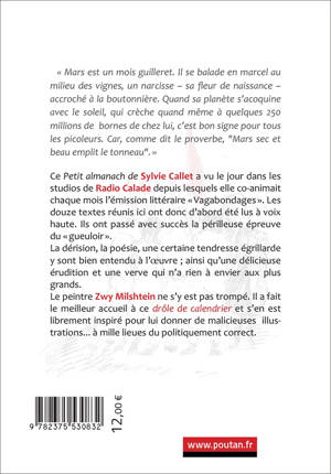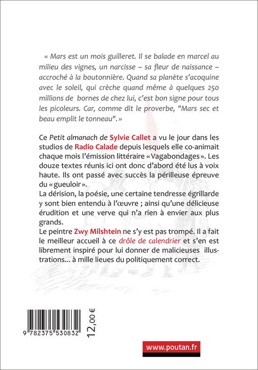 Ce Petit almanach de Sylvie Callet, a vu le jour dans les studios de Radio Calade depuis lesquels elle co-animait chaque mois l’émission littéraire « Vagabondages ». Les douze textes réunis ici ont donc d’abord été lus à voix haute. Ils ont passé avec succès la périlleuse épreuve du « gueuloir ». La dérision, la poésie, une certaine tendresse égrillarde y sont bien entendu à l’œuvre ; ainsi qu’une délicieuse érudition et une verve qui n’a rien à envier aux plus grands. Le peintre Zwy Milshtein ne s’y est pas trompé. Il a fait le meilleur accueil à ce drôle de calendrier et s’en est librement inspiré pour lui donner de malicieuses illustrations… à mille lieues du politiquement correct.