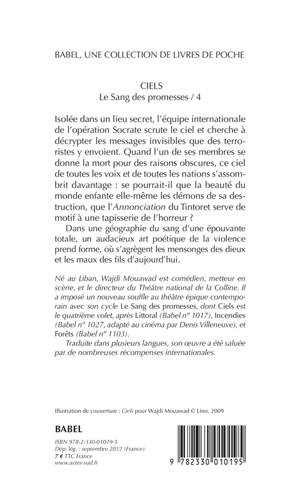 «Ciels »clôt en contrepoint la tétralogie du «Sang des promesses», après «Littoral», «Incendies» et «Forêts». Six personnages enfermés dans un lieu secret tentent de résoudre, grâce à des moyens technologiques ultrasophistiqués d'écoute et d'espionnage, une énigme liée à un attentat terroriste en préparation. Mais, tandis qu'ils tentent de sauver le monde, ils sont confrontés à leur propre vie privée puisque, ne pouvant en aucun cas dévoiler où ils se trouvent ni pour combien de temps, ils voient s'effriter peu à peu la trame de leur propre quotidien.