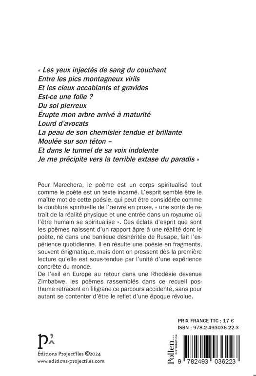 Pour Marechera, le poème est un corps spiritualisé tout comme le poète est un texte incarné. L’esprit semble être le maître mot de cette poésie, qui peut être considérée comme la doublure spirituelle de l’oeuvre en prose, « une sorte de retrait de la réalité physique et une entrée dans un royaume où l’être humain se spiritualise ». Ces éclats d’esprit que sont les poèmes naissent d’un rapport âpre à une réalité dont le poète, né en 1952 dans une banlieue déshéritée de Rusape, fait l’expérience quotidienne. Il en résulte une poésie en fragments, souvent énigmatique, mais dont on pressent dès la première lecture qu’elle est sous-tendue par l’unité d’une expérience concrète du monde. <br /> De l’exil en Europe au retour dans une Rhodésie devenue Zimbabwe, les poèmes rassemblés dans ce recueil posthume retracent en filigrane ce parcours accidenté, sans pour autant se contenter d’être le reflet d’une époque révolue.