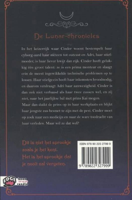 Als prins Kai opeens in haar werkplaats staat, verandert Cinders hele leven. En het laatste wat ze had verwacht, is dat ze het middelpunt van een intergalactische strijd zou worden. Cinder zal moeten kiezen tussen plicht en vrijheid, loyaliteit en verraad - maar om de toekomst van haar wereld te beschermen, zal ze eerst de geheimen uit haar verleden moeten ontrafelen.