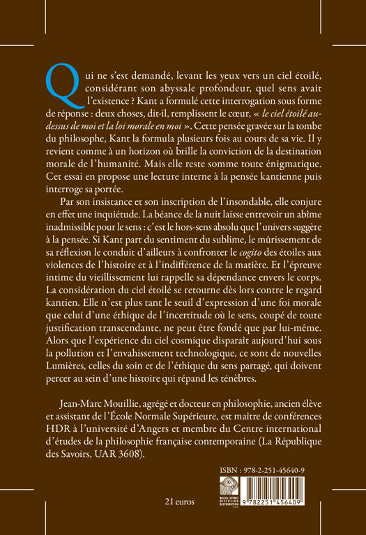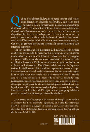Qui ne s’est demandé, levant les yeux vers un ciel étoilé, considérant son abyssale profondeur, quel sens avait l’existence ? Kant a formulé cette interrogation sous forme de réponse : deux choses, dit-il, remplissent le coeur, « le ciel étoilé au-dessus de moi et la loi morale en moi ». Cette pensée gravée sur la tombe du philosophe, Kant la formula plusieurs fois au cours de sa vie. Il y revient comme à un horizon où brille la conviction de la destination morale de l’humanité. Mais elle reste somme toute énigmatique. Cet essai en propose une lecture interne à la pensée kantienne puis interroge sa portée.