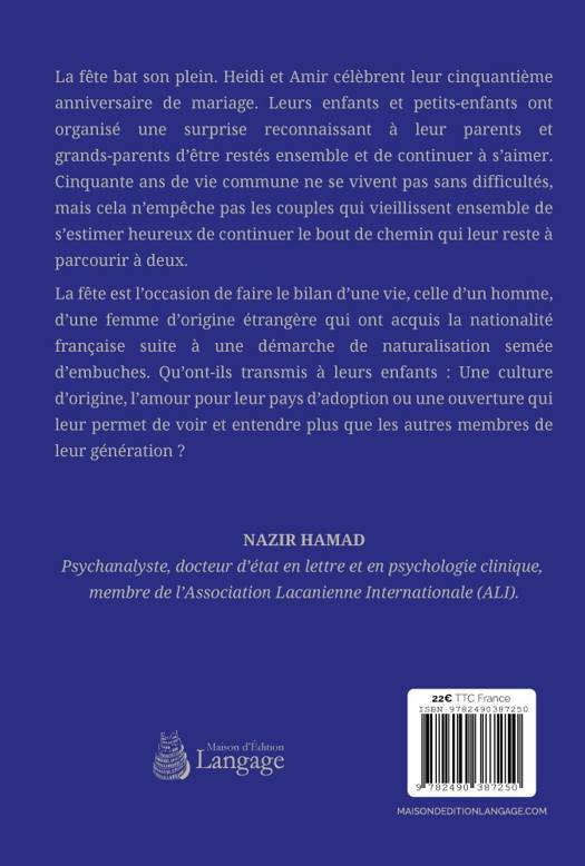 Ce livre parle d’un phénomène qui tend à disparaitre : se marier, accepter le meilleur et le pire et vieillir ensemble. Les enfants et les petits enfants font une surprise à leurs parents et grands-parents. Ils organisent une fête à l’occasion de leurs cinquante ans de mariage. Les amis et une bonne partie de ceux qui les ont accompagnés dans à un moment de leur vie sont conviés. La fête sera l’occasion pour les parents de faire le bilan de leur vie. Des personnes étrangères qui fondent une famille et qui cherchent à s’enraciner dans une nouvelle terre adopter une nouvelle culture. Que leur faut-il abandonner pour appartenir et que vont-ils transmettre de leur histoire ? Ils savent, cinquante ans après, que cet exercice n’est jamais simple.<br /> Une très belle histoire sur l’immigration d’un écrivain psychanalyste.