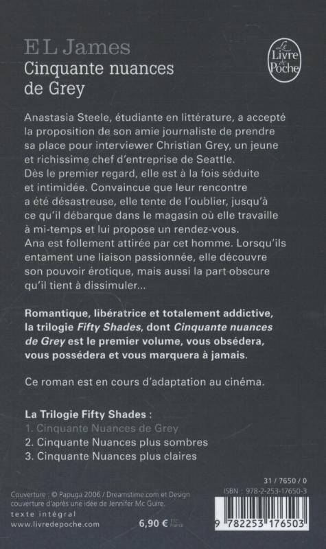 Anastasia Steele, étudiante en littérature, a accepté la proposition de son amie journaliste de prendre sa place pour interviewer Christian Grey, un jeune et richissime chef d’entreprise de Seattle. Dès le premier regard, elle est à la fois séduite et intimidée. Convaincue que leur rencontre a été désastreuse, elle tente de l'oublier, jusqu'à ce qu'il débarque dans le magasin où elle travaille à mi-temps et lui propose un rendez-vous. Ana est follement attirée par cet homme. Lorsqu'ils entament une liaison passionnée, elle découvre son pouvoir érotique, ainsi que la part obscure qu’il tient à dissimuler... Romantique, libératrice et totalement addictive, la trilogie Fifty Shades, dont Cinquante nuances de Grey est le premier volume, vous obsédera, vous possédera et vous marquera à jamais.
