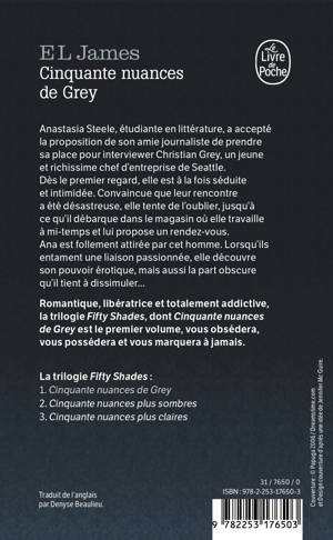 Anastasia Steele, étudiante en littérature, a accepté la proposition de son amie journaliste de prendre sa place pour interviewer Christian Grey, un jeune et richissime chef d’entreprise de Seattle. Dès le premier regard, elle est à la fois séduite et intimidée. Convaincue que leur rencontre a été désastreuse, elle tente de l'oublier, jusqu'à ce qu'il débarque dans le magasin où elle travaille à mi-temps et lui propose un rendez-vous. Ana est follement attirée par cet homme. Lorsqu'ils entament une liaison passionnée, elle découvre son pouvoir érotique, ainsi que la part obscure qu’il tient à dissimuler... Romantique, libératrice et totalement addictive, la trilogie Fifty Shades, dont Cinquante nuances de Grey est le premier volume, vous obsédera, vous possédera et vous marquera à jamais.